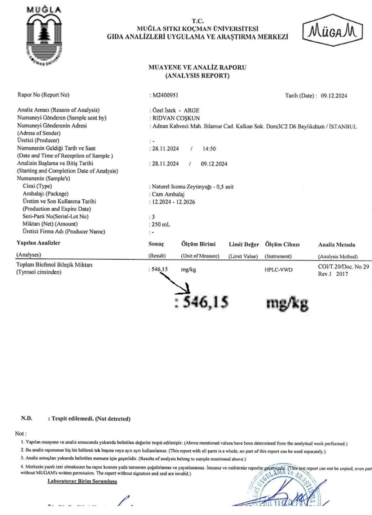 Özenli üretim sürecinin sonucu ve göstergesi olarak muğla üniversitesinde yaptırdığımız polifenol analizi sonucu zeytinyağımız 546 mg / kg polifenol oranı ile Ultra Yüksek Polifenole sahip olduğu belgelenmiştir. Buna ek olarak zeytinyağlarımız 0.4 asit oranı ile kaliteli Zeytinyağı sınıfına girmektedir